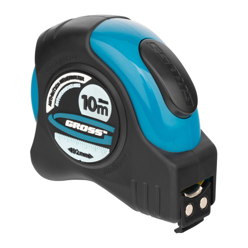 GROSS - Metro a nastro "Schlagfest" - 10 m x 25 mm Metro a nastro da 10 m con corpo in gomma, magnetico, doppia scala, rivestimento in nylon. Pratico, preciso e resistente. Un compagno indispensabile! Il metro "Schlagfest" di GROSS consente di misurare lunghezze fino a 10 metri . Sarà utile in tutti i tipi di cantieri: costruzione, ristrutturazione, taglio, ecc. Ti permetterà di misurare con precisione lunghezze, superfici e altro. Resistente a ogni prova La costruzione del metro gli consente di resistere a eventuali urti e cadute. Il nastro è rivestito in nylon e protetto dalla corrosione per una durata più lunga. Gancio magnetico Sistema TrueZero Pratico Il metro è dotato di un gancio magnetico che facilita l'uso. Il gancio si manterrà saldamente su una superficie metallica e ti permetterà di effettuare tutte le misurazioni facilmente. Il sistema TrueZero garantisce la precisione dello zero del metro: il nastro è perfettamente tarato e misura a partire da 0 cm. In caso di