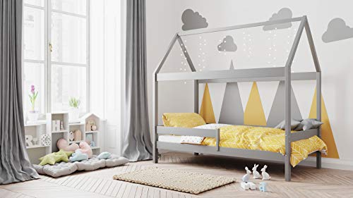 WFL GROUP Letto a Casa con Sponda di Sicurezza Letto Singolo in Solido Legno 90x190 90x200 80x180 80x160-Letto Montessori a Capanna-Letto per Bambini e Bambine-Legno di Pino Naturale- 180 x 80-Grigio