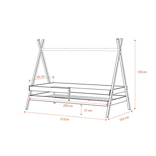 WFL GROUP Letto Tenda Tipi Letto singolo in solido legno 3 misure 90x190 80x180 80x160-Letto Capanna Montessori-Letto per Bambini e Bambine-Legno di Pino Naturale, Colore:Pino, Size:200 x 90 cm