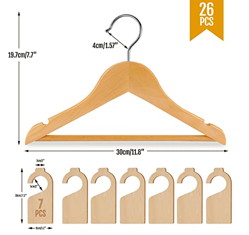 【Appendini in legno adatti ai bambini】 Set di 26 appendini in legno naturale con 7 divisori per guardaroba in legno per bambini, realizzati in legno massello di alta qualità, danno un profumo di legno naturale, ben lucidato con superficie liscia che non ha spigoli vivi o sbavature, proteggendo poco mani.