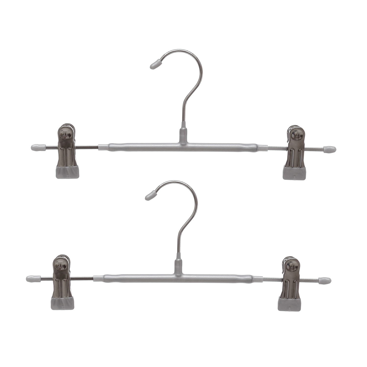 Set composto da 2 grucce con gancio e mollette, accessori ideali per appendere gonne e pantaloni senza pieghe. La superficie rivestita di gomma permette la massima aderenza e impedisce la formazione di segni sui tessuti.