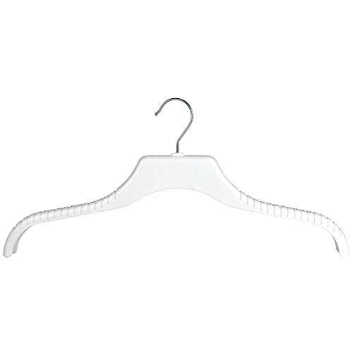 Questa gruccia in plastica per maglie ha una forma tradizionale, con un angolo spalla alto, per sostenere la parte alta delle maglie.