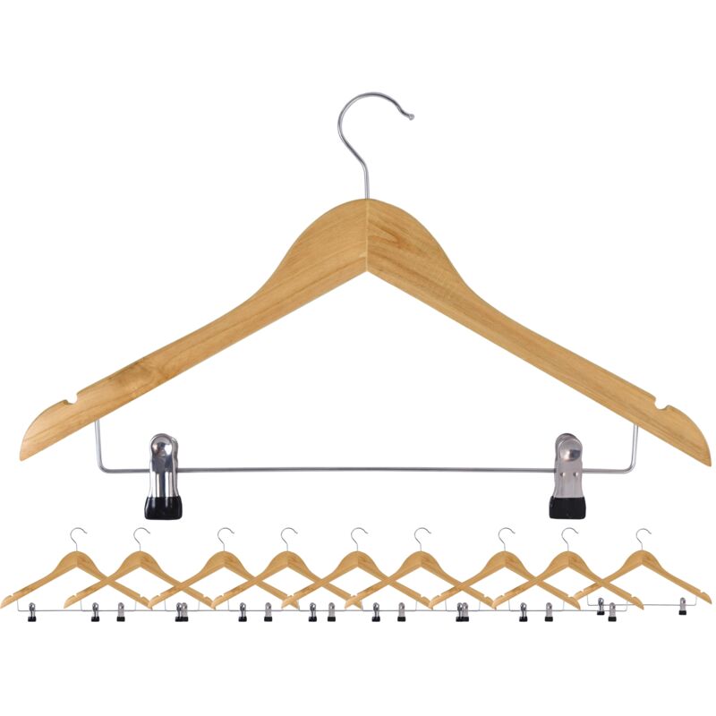 Gruccia in legno con clip Henryk Destinazione d'uso: riporre vestiti | Colori: legno naturale | Il set include: 10 grucce Henryk hanno tutto ciò che una gruccia solida dovrebbe avere. Scegliendo le nostre grucce, scegli una qualità eccellente! Sono realizzati in legno naturale. Grazie a questo, l'armadio starà benissimo sia nell'armadio che sugli scaffali in una boutique esclusiva. Hanno tacche speciali per appendere i vestiti sulle cinghie. Possiamo appendere con successo un intero set di vestiti: pantaloni, un gilet, una giacca. Una traversa in metallo con clip è perfetta per riporre le parti inferiori del tuo guardaroba. Questo ti farà risparmiare molto tempo: non dovrai stirare le pieghe. Se ci tieni alla qualità e all'aspetto dei tuoi vestiti, assicurati di scegliere Henryk invece delle sottili grucce in metallo, facili da piegare e dalle quali i vestiti scivolano facilmente, causando disordine nel tuo guardaroba. Caratteristiche del prodotto - durevolezza - è realizzato in legno