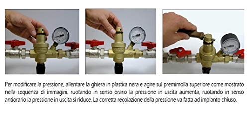 Per modificare la pressione, allentare la ghiera in plastica nera e agire sul premimolla superiore. Ruotando in senso orario la pressione in uscita aumenta, ruotando in senso antiorario la pressione in uscita si riduce. La corretta regolazione della pressione va fatta ad impianto chiuso.