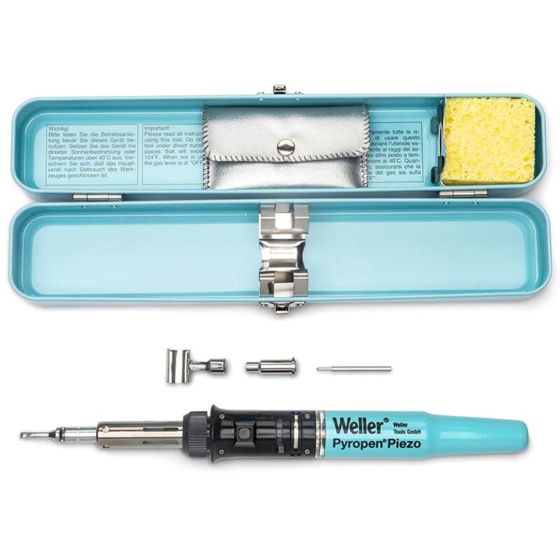 Saldatore Weller Pyropen profi line a gas butano. Il saldatore de gas butano Pyropen Piezo Butane de Weller è un saldatore de autoaccensione con funzioni de saldatura e soffiaggio a caldo. Lo strumento ha un de tempo di riscaldamento rapido e a carica di butanegas dura fino a 3 ore. È ideale per saldare in movimento e aiuta a a completare las attività de di saldatura ovunque, senza necessitare de una fonte de alimentazione o un cavo que ostruzione. Ha unaa temperatura regolabile tra 250 °C e 500 °C quando usa come saldatore e fino a 650 °C quando come soffiatore d'aria calda de. Grazie all'accenditore piezoelettrico, il Weller Pyropen può essere comodamente acceso senza bisogno di un altro strumento. - saldatura in movimento, anche all'aperto: completare il vostro lavoro de saldare ovunque, senzade una fonte alimentazione o un cavo che ostruisce il cammino - Set in valigetta metallica - funzione piezoelettrica de accensione automatica: comodo avvio con una sola mano con pulsante de