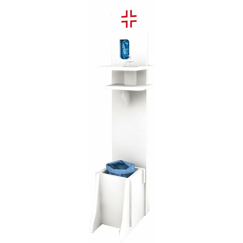 Piantana in materiale antiurto Composto da: Porta guanti Porta igienizzanti Pattumiera guanti, igienizzante Buste immondizia non in dotazione DIMENSIONI 25x25xH145 cm.