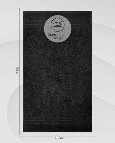 ✔️Qualità: Set composto da 10 Asciugamani professionali, realizzati in morbidissima e resistente spugna 380Gr Colore nero composizione 95% Cotone 5% Poliestere resistenti nel tempo ai frequenti lavaggi e al continuo utilizzo