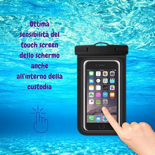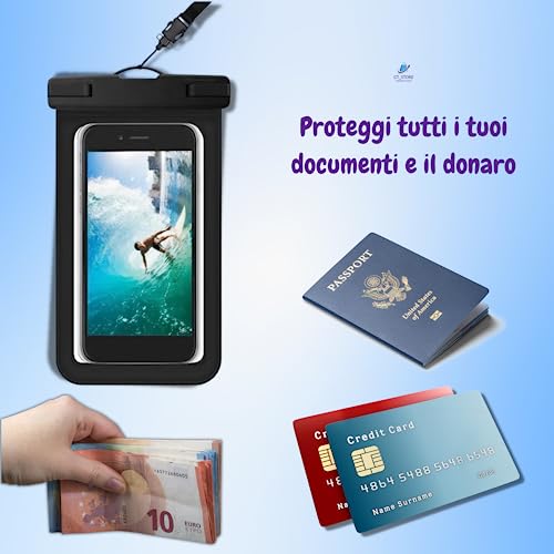 TENUTA STAGNA Grazie alla sua chiusura ermetica, la custodia impermeabile cellulare mantiene al sicuro dall'acqua. Puoi portarlo con te anche sotto la pioggia o durante attività acquatiche senza rischiare danni al dispositivo, ma anche a documenti e beni preziosi.