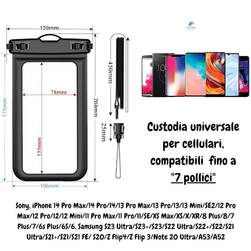 ✅ COMPATIBILITÀ UNIVERSALE La custodia impermeabile per smartphone è progettata per adattarsi a diversi modelli di smartphone. Indipendentemente dalla marca o dal modello del tuo dispositivo, puoi usufruire della protezione offerta da questa custodia per cellulari fino a 7 pollici di grandezza.