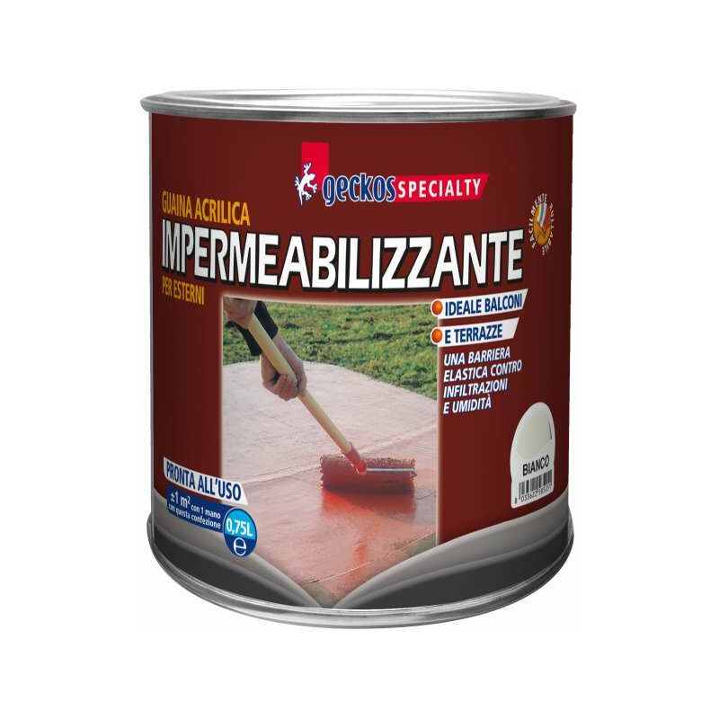 Guaina acrilica impermeabilizzante per esterni. Ideale per terrazze e balconi. Colore Bianco Tipologia - Guaine Marca - Geckos Modello - ICGUAELB.0.75 Colore - Bianco Quantità - 1 Formato - 0,75 L Caratteristiche - Pronta all'uso, una barriera elastica contro infiltrazioni e umidità Garanzia - NO Made in Italy - SI Antiscivolo - NO Uso esterno - Sì Uso interno - NO Resa - 1 m² litro Posa - Facilmente rullabile Coibentato - Balconi e terrazze non piastrellati Resistenza all'acqua - si Resistenza al calpestio - con spessori eccessivi si segna Copertura - buona COV - 100g/l