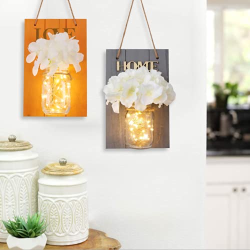 GUANSHAN Applique da parete in barattolo di muratore 2PCS, luci a strisce a LED con fiore artificiale e tavola di legno, applique da parete rustica per camera da letto, decorazione da parete