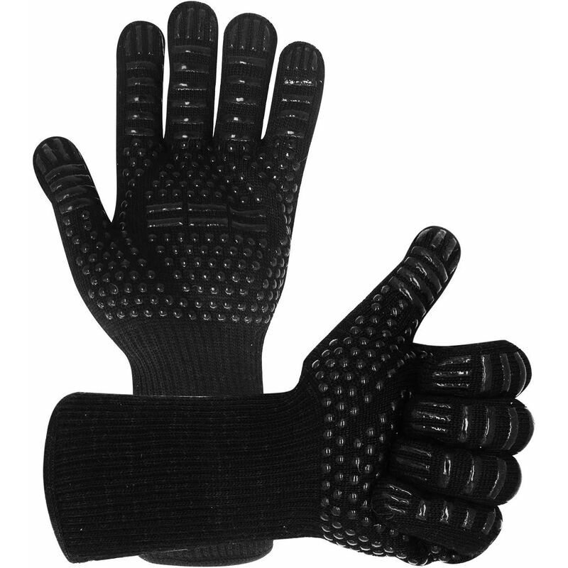 a 800°C per 10 secondi. Guanti resistenti al calore perfetti per grigliare, cuocere al forno, grigliare, friggere, girare, affumicare, saldare, accendere falò, caminetti e molto altro Ampia protezione del polso: manterrà le mani, i polsi e il braccio anteriore al sicuro. Fodera in cotone super morbido per consentire alle tue mani di respirare e non sudare. Facili da indossare, pulire e riporre, flessibili: non c'è differenza tra la mano destra o sinistra dei nostri guanti da barbecue, puoi indossali su entrambi i lati. Le grandi dimensioni si