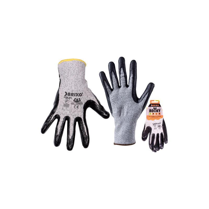 Guanti Brixo Rocky Cotone/Nitrile Dorso cotone, palmo nitrile resistente al taglio. Alto livello di protezione meccanica, polso elastico, dorso areato. Utilizzi: Iniezione e stampaggio materiali plastici, industria del vetro, industria automobilstica. Certificazioni EN388:2016 - 4244B-EN420 Taglia L...