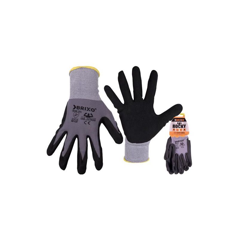 Guanti Brixo Rocky Nylon-Spandex/Nitrile Dorso nylon/spandex, palmo nitrile sabbiato. Forma ergonomica, massima destrezza e sensibilità tattile. Utilizzi: lavorazioni e assemblaggi di piccoli pezzi scivolosi, industria automobilistica, logistica & magazzino, giardinaggio, pittura. Certificazioni EN388:2016 - 4121X-EN420 Taglia XL
