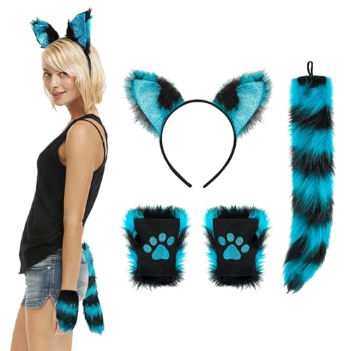 Set di guanti per capelli con orecchie di volpe in finta pelliccia e coda di volpe, set di soffici lupi e volpi, per cosplay, coda lunga, accessori per travestimenti, accessori colorati per Halloween,