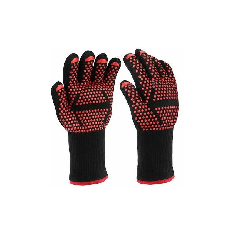 GUANTI DA FORNO GRILL RESISTENTI AL CALORE - I guanti da barbecue sono realizzati in fibre di aramide per fornire la massima protezione dal calore fino a 800 ° C (1472 ° F). Questa elevata capacità di resistenza al calore rende i guanti da barbecue un materiale ideale per grigliare, cuocere al forno e pranzare all'aperto. Questi guanti da barbecue possono proteggere efficacemente braccia e polsi da scottature e ustioni. I polsini di questi guanti da grill sono realizzati con materiali super traspiranti, che ti consentono di portare aria fresca per evitare che le tue mani sudino alle alte temperature. i guanti da grill sono rivestiti con silicone alimentare sulla superficie. Il design in silicone antiscivolo sui guanti da grill può darti una presa forte. Questi guanti da forno possono assicurarsi che nulla ti sfugga dalle mani. Puoi indossare i nostri guanti da barbecue su entrambi i lati. Lavabile in lavatrice, è facile da pulire. E puoi appenderlo facilmente con l'anello interno in