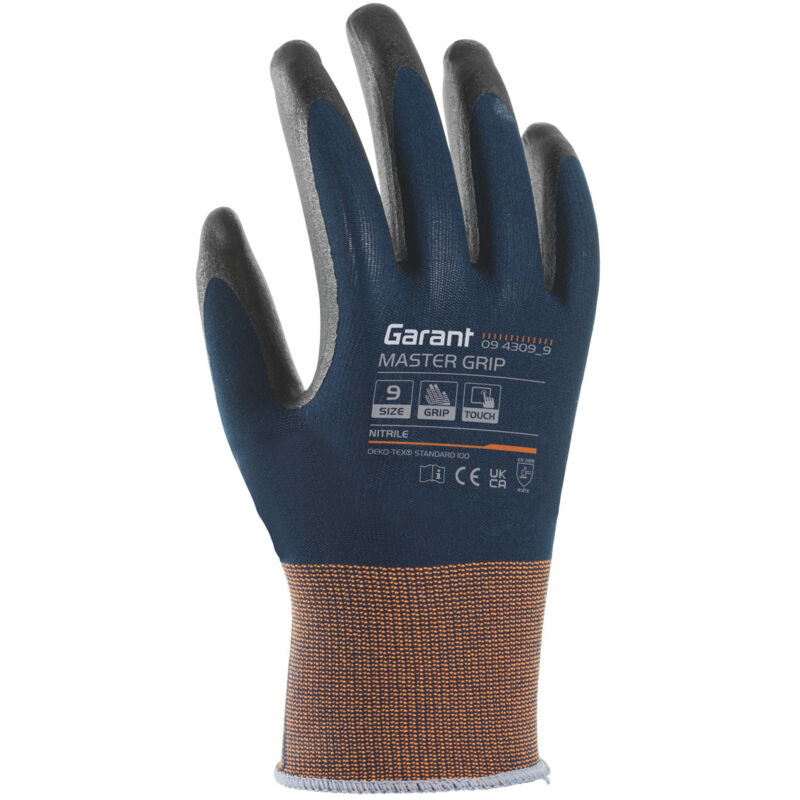Guanti per montaggio MASTER GRIP. Il rivestimento grip presente sul palmo permette una presa extra forte garantendo una tenuta particolarmente antiscivolo. Il rivestimento in schiuma di nitrile è traspirante e assicura una buona sensibilità tattile. Utilizzabile su touchscreen, in modo che sia possibile utilizzare smartphone e altri schermi sensibili al tatto senza dover estrarre il guanto. Norma: EN 388, EN ISO 21420 Nota: Il quantitativo minimo d'ordine corrisponde a una confezione o a un suo multiplo. Dati tecnici Tipo di prodotto Guanti multiuso Rivestimento Schiuma di nitrile / nitrile Tecnologia di lavorazione a maglia 15G Materiale supporto Nylon Colore blu / nero Variante del rivestimento Palmo EN 388 4121X Abbigliamento standard Oeko-Tex Standard 100 Utilizzo riutilizzabile Serie Master Grip Misure guanti da lavoro 10