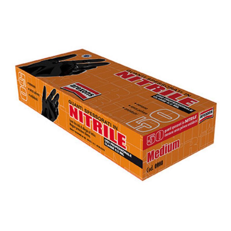 In nitrile Spessore 0,28 mm Per uso professionale, riutilizzabili, senza polvere, ottima sensibilità. Confezione da 50 pezzi A norma EN 374 Taglia M