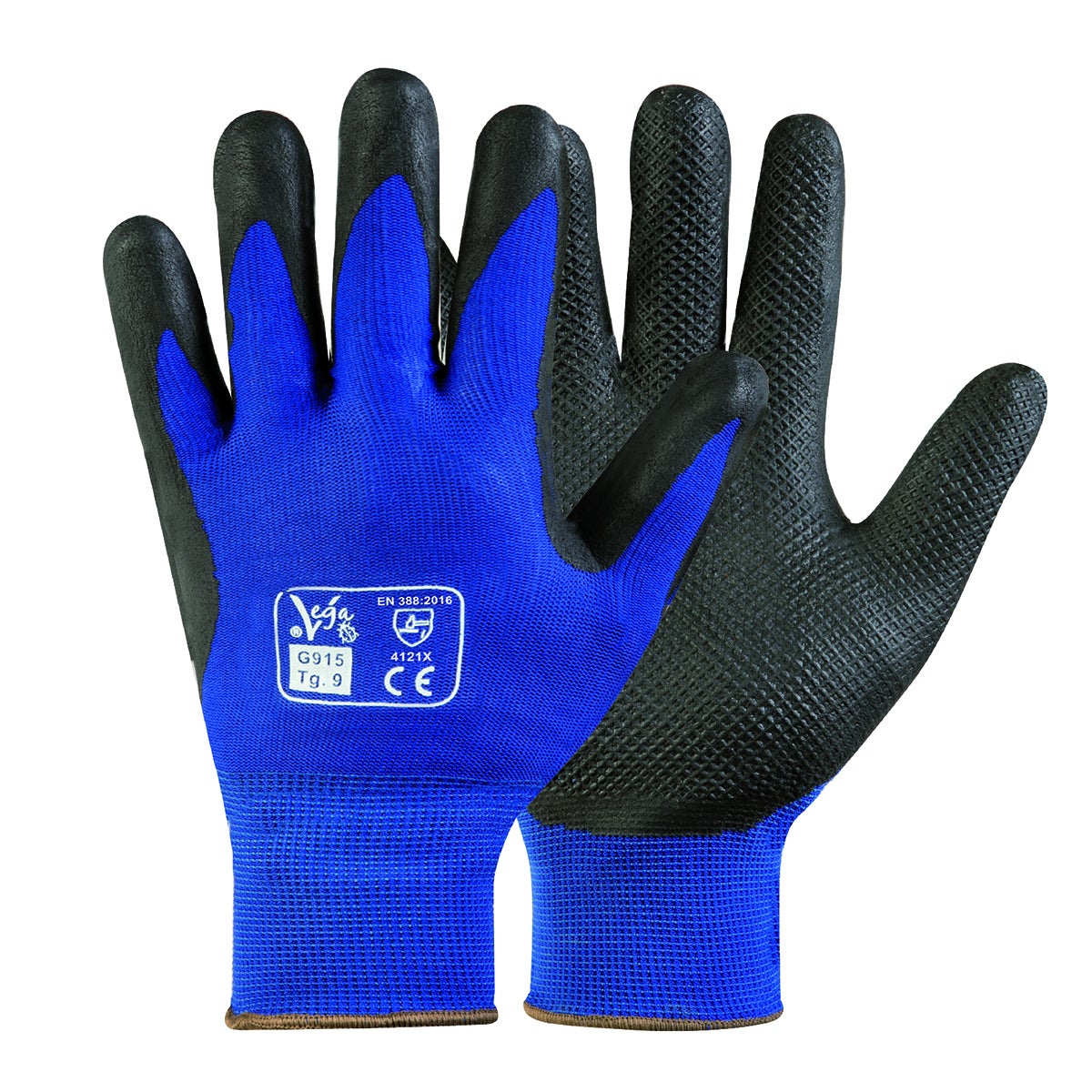 Guanto con supporto in maglia di poliammide senza cuciture e spalmatura in nitrile zigrinato con trama a rombi.