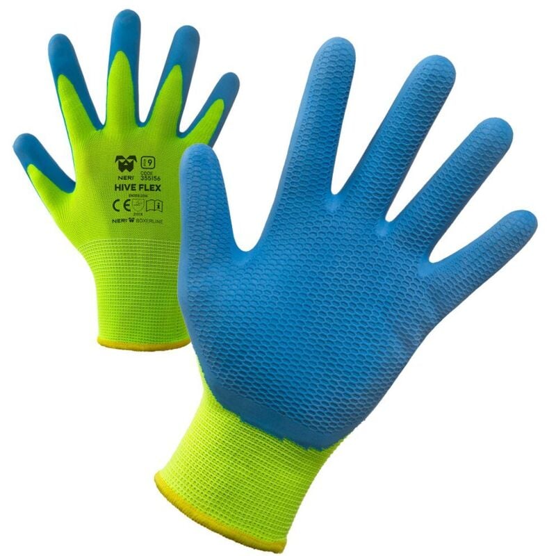 I Guanti di protezione Neri Hive Flex sono dispositivi estremamente flessibili e morbidi, caratterizzati da un supporto in leggero poliestere e spalmatura su palmo e dita in schiuma di lattice con finitura a nido d'ape. Questo rivestimento eco- friendly, rende la superficie del guanto antiscivolo, potenziandone il grip, sia su superfici asciutte che umide. Il lattice di gomma ha ottime proprietà elastiche, offre buona resistenza all'abrasione e alla lacerazione e contribuisce a prolungare la vita del guanto, mentre la forma anatomica del guanto e la completa assenza di cuciture nei punti di sforzo conferiscono alla mano una maggior sensazione di comfort riducendone l'affaticamento. Il guanto a filo continuo calibro 13 in poliestere è stato realizzato nel colore giallo fluo per aumentarne la visibilità passiva, a favore della sicurezza di chi lo indossa in condizioni di ridotta visibilità o scarsa luce.I Guanti di protezione Neri Hive Flex sono DPI omologati CE e conformi alle