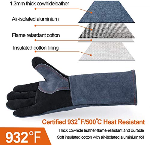 Guanti da Saldatore Foderati in Pelle Bovina ad Alta Temperatura BBQ, Guanti da Lavoro per Grigliate Pane Barbecue Camino Cucina