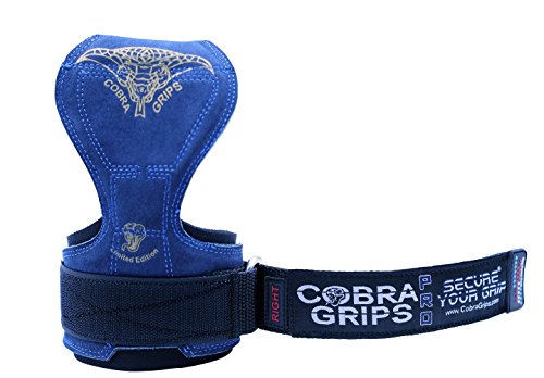 Guanti per sollevamento peso, resistenti, con cinghie alternative ai ganci Power hook, regolabili, in neoprene, con imbottitura, Cobra Grips, PRO Blue Leather V2