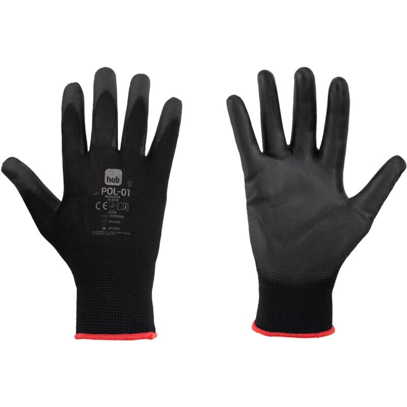 Guanti poliestere/poliuretano 'special hob pol-01' tg. 7 - colore nero Liner 100% poliestere. Spalmatura in poliuretano. Leggero ed elastico, eccellente sensibilita' tattile. Buona resistenza all' abrasione e durata. Senza cuciture, dito pollice ad ala, polso elasticizzato e dorso aerato. Impiego: industria automobilistica, manipolazioni delicate, magazzino/logistica, hobbistica, assemblaggio di piccoli pezzi. Certificazioni EN 388:2016+A1:2018. Marcatura CE. Dispositivo di Protezione Individuale - II categoria, CE ai sensi del Regolamento (UE) 2016/425. Confezionato al paio con cavallotto. Tg. 7 - colore nero Categoria dell'articolo: Segnaletica ed antinfortunistica - Guanti da lavoro