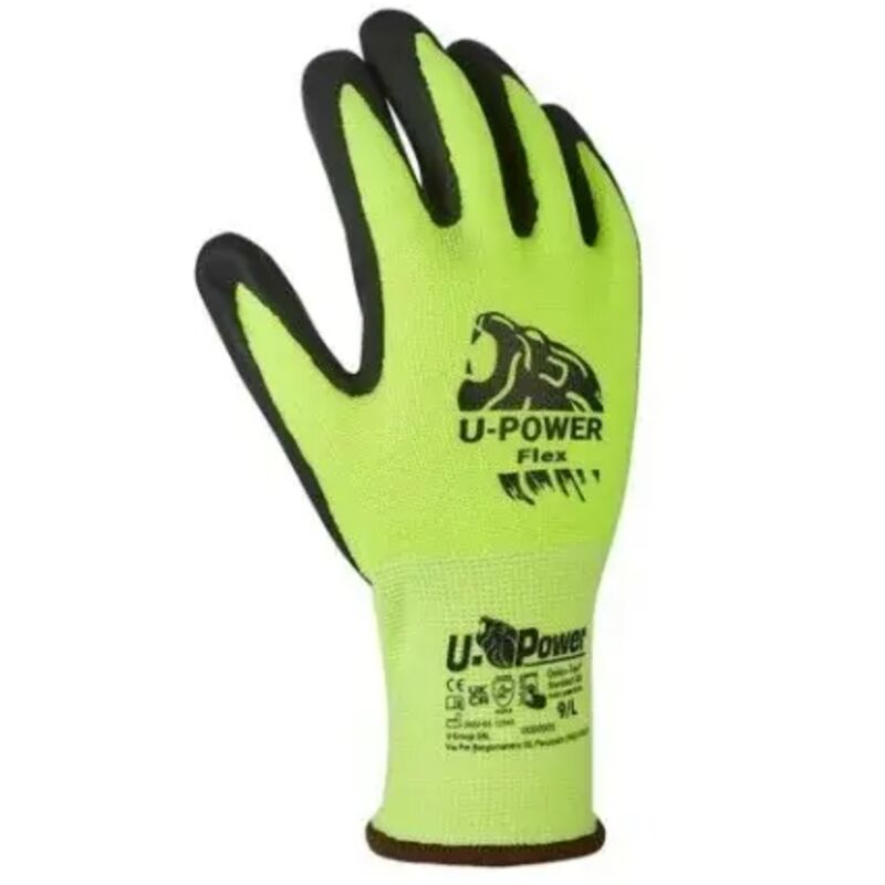 Guanti U-Power Flex Giallo Fluo, contro i rischi meccanici e termici con palmo in Nano schiuma di nitrile. Guanti da lavoro traspiranti con fodera in nylon spandex finezza 15 in grado di offrire un'ottima sensibilità e destrezza superiore (livello 5). Guanti touch screen molto pratici e confortevoli che assicurano mani fresche e asciutte, ottima vestibilità e massima aderenza sia in ambiente asciutto che bagnato. Guanti da lavoro meccanico, settore automobilistico e relativo aftermarket, per uso macchine e attrezzatura, fabbricazione di metalli, servizi medici di emergenza, petrolio e gas, servizi di pubblica utilità, assemblaggio di piccole parti. Ideali in caso di maneggiamento di materie prime e per i sistemi di regolazione dei componenti di prelievo, fissaggio e avvitamento. Guanti per magazziniere e settore aerospaziale. SPECIFICHE TECNICHE Classificazione: EN 388:2016 - EN 407:2020