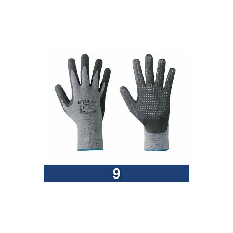 Guanto in filo continuo nylon-elastene/nitrile schiumato. Spalmatura sul palmo in nitrile schiumato. Antipelucchi. Palmo puntinato per una miglior presa. Ottima resistenza all'abrasione e al contempo notevole flessibilità e destrezza. Polso elasticizzato e dorso aerato. Colore: grigio/nero. Taglia: 9 Confezione da 12 pezzi.
