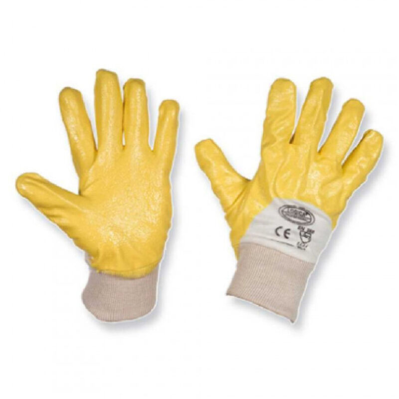 A filo continuo di cotone bianco, con spalmatura in nitrile giallo NBR sul palmo, dita e parte del dorso. Con polsino elastico i
