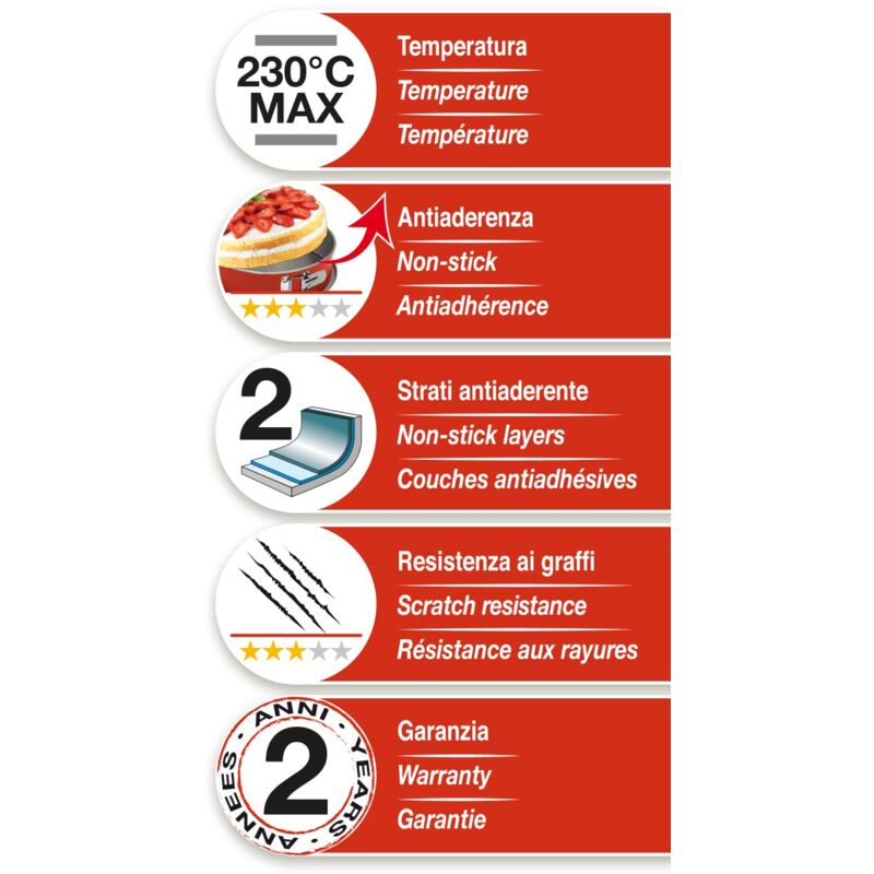 Materiali: Metallo di supporto: acciaio Rivestimento antiaderente: rivestimento antiaderente. N. strati del rivestimento antiaderente: doppio strato. Caratteristiche: privo di BPA, PFOA e metalli pesanti Dimensioni disponibili: 12 x 1,9cm Temperatura max: 230°C Colori: Colore esterno: rosso: Colore interno: grigio La linea: Realizzati in acciaio Hi-Top con rivestimento antiaderente doppio strato, gli stampi da forno della linea Rossana garantiscono risultati perfetti di cottura ed antiaderenza. Grazie alla particolare conducibilità termica dell'acciaio utilizzato e al suo basso spessore, la cottura in forno di tutti i cibi, dolci e salati, risulta rapida ed uniforme. Il rivestimento antiaderente di qualità assicura ottimi risultati nella sformatura del dolce e nella cottura di piatti salati, garantendo inoltre la facilità nella pulizia dello stampo dopo l'uso. Il piacere italiano di cucinare: La storia di Guardini nasce da una spiccata passione per la cucina e dall'inesauribile