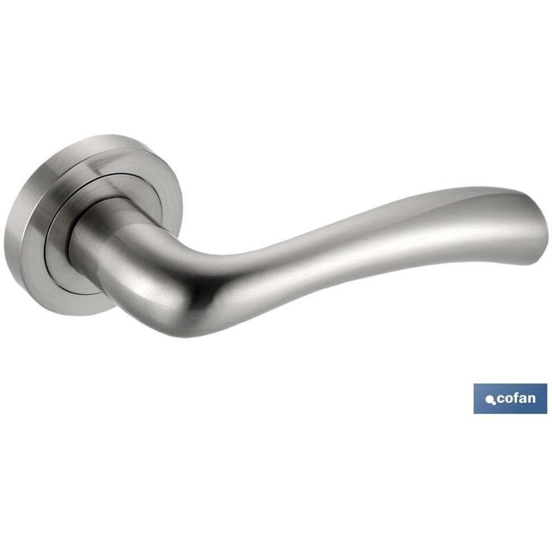 Guarnitura Oslo in alluminio con rosetta tonda in nichel. Caratteristiche tecniche: Materiale: Alluminio/Nichel Misure: 107 x 64 mm Diametro: 50 mm