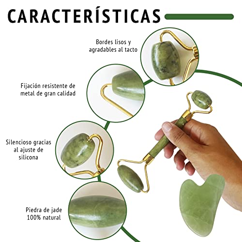 Set da 3 per massaggio viso e bellezza con rullo di giada e guasha. Scopri il segreto che offre il nostro set di rulli facciali e la sua pietra di giada. Possiede benefici per la salute, e proprietà lenitive, rilassanti e stimolazione dell'energia vitale. Secondo la medicina orientale sono perfetti come massaggiatori facciali.