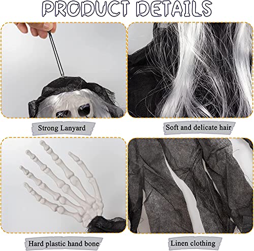 Contenuto della confezione: 2 decorazioni fantasma da appendere in nero e viola (circa 94 cm di altezza), con teschio inquietante viso e lunghi capelli bianchi, abiti fluenti e led lampeggianti occhi malvagi rossi, così orribile durante la notte di Halloween, aggiunta assolutamente perfetta alle tue decorazioni all'aperto e al coperto di Halloween