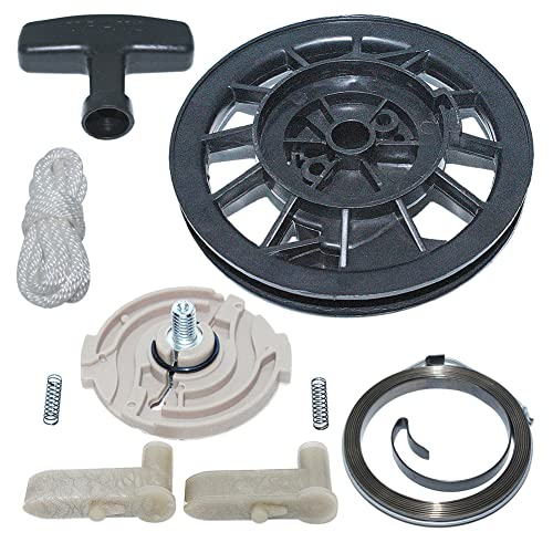【COSA OTTIENI】: 1 puleggia di avviamento X, 1 molla di recupero X, 1 impugnatura per impugnatura di avviamento X, 1 corda di avviamento X, 2 cricchetto di avviamento X, 1 guida a cricchetto X, 1 molla di attrito X, 1 vite di regolazione X, 2 ritorni X Primavera