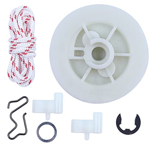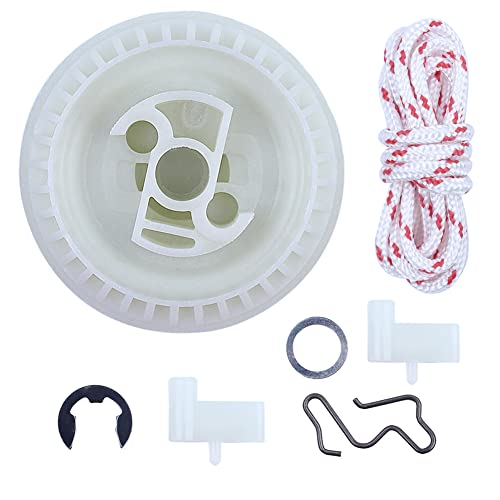 【COSA OTTIENI】: 1 X puleggia di avviamento a rinculo, 1 X fune di avviamento, 2 X Pawl Dogs, 1 X primavera, 1 X rondella, 1 X E-Clip