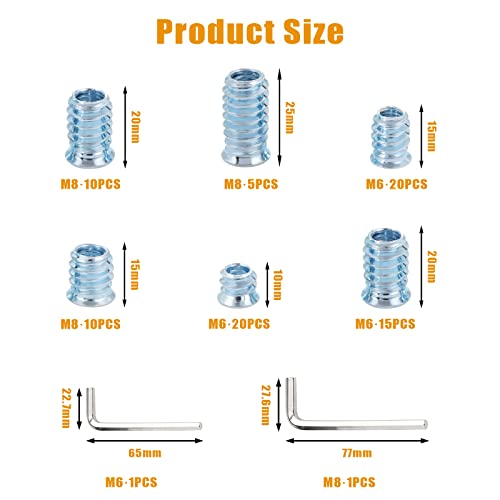 Gueenky 80 Pezzi Inserto Filettato Legno, M6 M8 Inserti Legno Dado di Inserto, 6 Dimensioni Dadi Esagonali Filettati Boccole Filettate per Legno Mobili, con Chiave, Acciaio al Carbonio