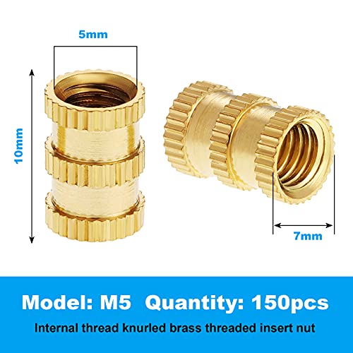 Gueenky 150 Pezzi Dadi Zigrinati in Ottone, M5x10x7 mm Inserti Filettati Zigrinati dadi in Ottone, Dadi Filettati Zigrinati per Stampaggio a Iniezione di Stampa 3D