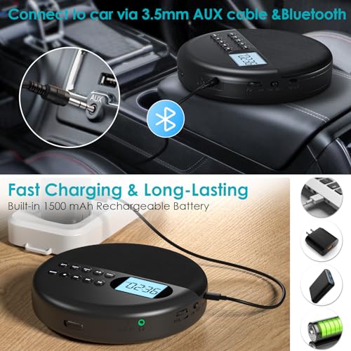 Lettore CD portatile con batteria ricaricabile: Il lettore CD portatile è dotato di una batteria ricaricabile da 1500 mAh, che può essere caricata tramite adattatore DC 5V/2A, power bank o computer con USB Standard con il cavo di ricarica incluso, con una carica completa di circa 3 ore con indicatore VERDE. Non è necessario utilizzare batterie AA o una fonte di alimentazione esterna costante durante la riproduzione di musica, portatile e conveniente.