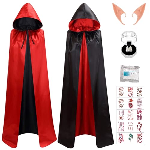 【mantello vampiro bambino consegna】 1x 90 cm mantello vampiro nero rosso con cappuccio,1x5g Adesivo per Pellet di Denti,1x 1 paio 17mm denti vampiro,20xhalloween cicatrici tatuaggi,1x1 paio orecchie elfo.