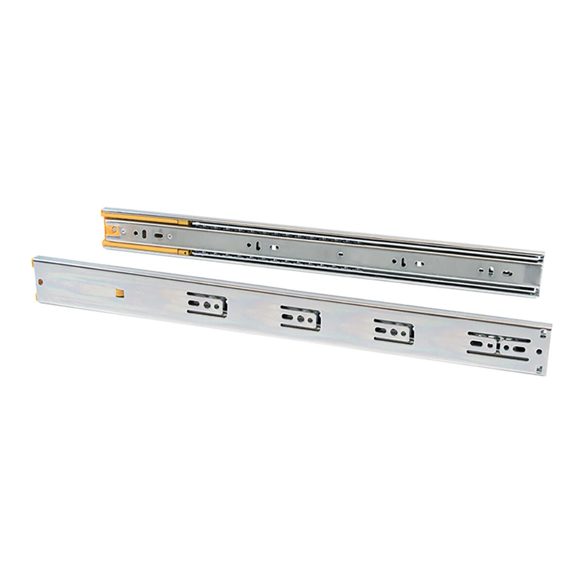 Guide con cuscinetti a sfera ed estrazione totale per cassetti con profondità di 300 mm. Montaggio al cassetto si realizza mediante viti e lo smontaggio con grilletto. Si forniscono in set completi con lato destro e sinistro.Carico massimo per set di 35 kg.. Ideale per carico massimo 35 Kg. Adatto per cassetti con profondità 300 mm. Chiusura soft del cassetto grazie al pistone ammortizzante in entrambe le guide.. Note per la grande capacità di carico che può arrivare a sopportare fino a 35 kg per cassetto.. Possiede un grilletto per lo smontaggio della guida.