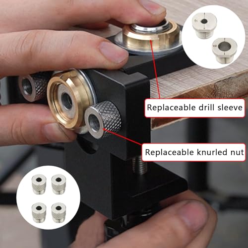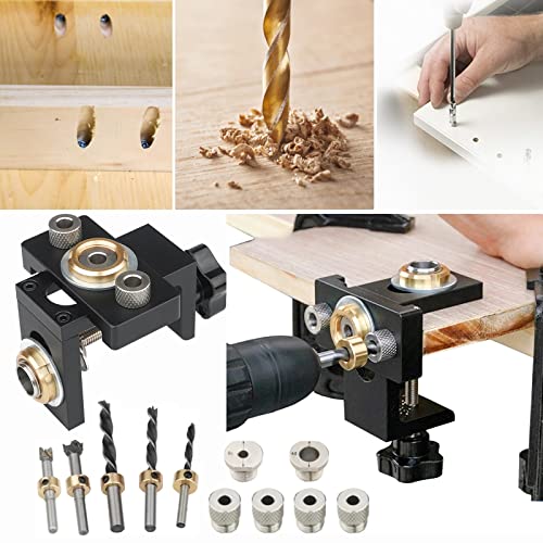 Ampia applicazione: questo strumento per punzonatura 3 in 1 per posizionatori di foratura è dotato di punte da 6 mm/8 mm/10 mm/12 mm/15 mm per soddisfare le vostre esigenze per diversi diametri di foro. Morsetto autoserrente integrato per un facile fissaggio della guida del trapano al legno. Disponibile per giunzioni di bordo, area, T e L.