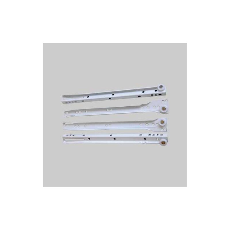 In acciaio laccato. Fissaggio sul fondo, scorrevole su rotelle in nylon con chiusura automatica. Portata kg.25. Fornite in set da 4 pezzi. Guide per cassetti 50 cm - marrone Guide per mobili