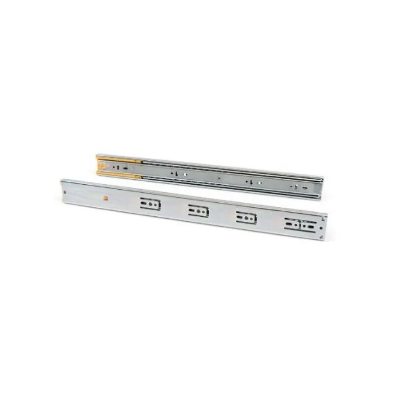 Guide a sfere per cassetti con estrazione totale e chiusura soft, altezza 45 mm, lunghezza 500 mm, acciaio zincato bianco. Guide con estrazione totale per cassetti con chiusura soft che fornisce una chiusura ammortizzata del cassetto, e uno scivolamento morbido e silenzioso grazie ai suoi cuscinetti a sfera di alta qualità. Sono noti, inoltre, per la grande capacità di carico che può arrivare a sopportare fino a 35 kg per cassetto. Il montaggio al cassetto si realizza mediante viti e lo smontaggio con grilletto.