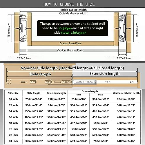 30 anni di e 1,5 mm di spessore Seel Le nostre guide per cassetti sono realizzate in teel laminato a freddo di alta qualità più spesso di 1,5 mm, i nostri corridori di apertura e chiusura test 100.000 volte. che è durevole e la normale della guida di scorrimento supera i 30 anni. Descrizione delle dimensioni dell'installazione: 26 mm di spazio tra cassetto e parete dell'armadio richiesto (sinistra 13 mm, destra 13 mm).