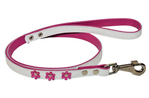 Guinzaglio, Vera pelle morbida, Foderata, Con motivo floreale, imbottito a mano, Bianco con fiori rosa, Finitura rosa