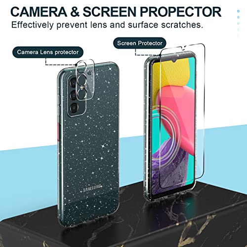 ✿Compatibilità: Glitter Trasparente Cover compatibile con Samsung Galaxy M23 5G, con 3 Pezzi Pellicola Protettiva + 3 Pezzi Pellicola Fotocamera. Si prega di controllare il modello del telefono prima dell'acquisto.