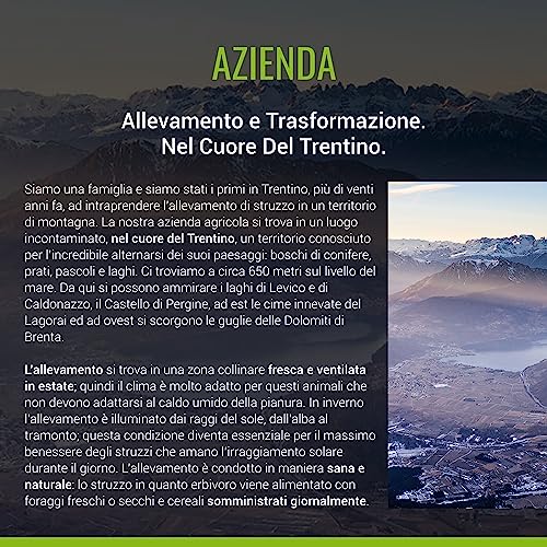 LA NOSTRA STORIA: Infine, il prodotto è prodotto in Italia da Più Gusto, un'azienda italiana specializzata nella produzione di alimenti di alta qualità e sostenibili, il che conferisce una maggiore affidabilità e sicurezza al prodotto.L'azienda si trova in Trentino e da 18 anni gestisce allevamenti di struzzi nel territorio della montagna.