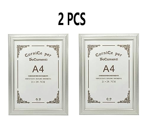 GUTEINTE Cornice per Foto A4 da Parete, per Certificati Diplomi Documenti 21 x 29.7 cm, Fornito con Vetro in Plexiglass di Protezione, Alta Definizione per Display, 2 pezzi (argento)