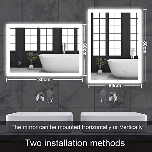 GuWet Specchio da Bagno a LED, Specchio a LED Rettangolare,80 x 60cm,CEE: A++, Controllo Tattile,con dimmerabile, bianco caldo/bianco freddo/neutro, 3000-6500 K